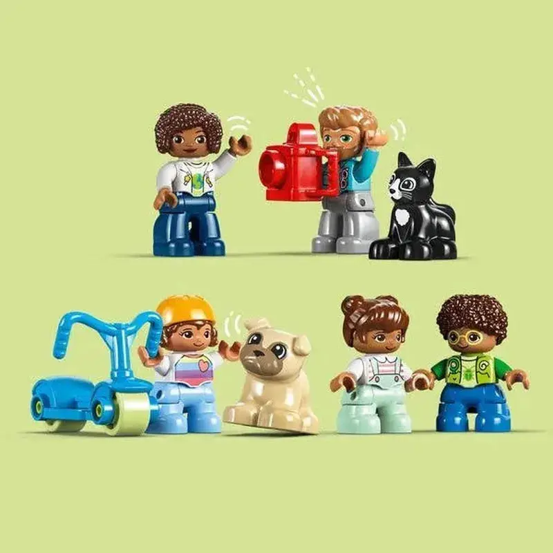 Het LEGO® DUPLO huis kan op 3 manieren worden gebouwd. Peuters kunnen één groot huis van 3 verdiepingen bouwen, een hoog gebouw of 2 kleinere woningen met een tuin.