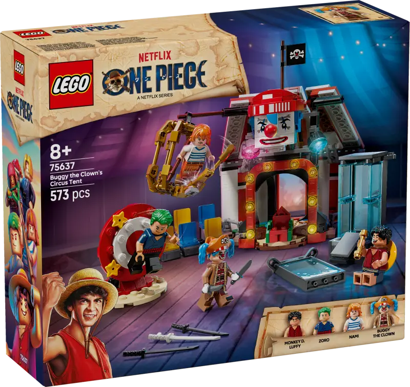 De LEGO® ONE PIECE Circustent van Buggy de Clown (75637) biedt kinderen van 8 jaar en ouder een spannend ONE PIECE-avontuur. Dit LEGO-animespeelgoed zit vol accessoires waarmee ze scènes uit de ONECE-serie kunnen naspelen of hun eigen verhalen kunnen creëren.