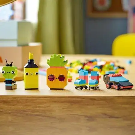 Deze veelzijdige LEGO® Classic bouwset bevat 333 stenen in verschillende formaten en levendige neonkleuren. 18 van de stenen hebben expressieve ogen die kinderen kunnen gebruiken om hun creaties tot leven te brengen. Inclusief gedrukte bouwinstructies voor 5 leuke modellen – een ananas, een markeerstift, een auto, een alien en rolschaatsen – en alles wat kinderen zelf bedenken! Er is ook een digitale versie van de bouwinstructies te vinden in de LEGO Builder app.