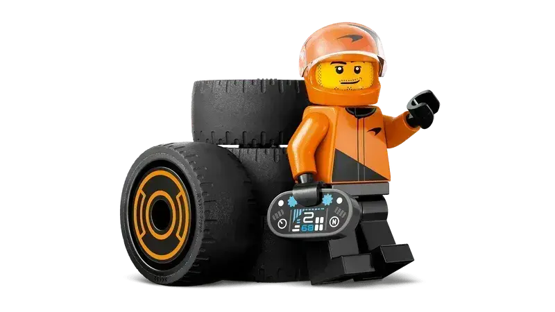 - Drie minifiguren: een coureur, een pitstopmedewerker en een racefan.
