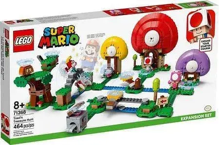 Spelers moeten vijanden verslaan en uitdagingen overwinnen in Toad Village met deze LEGO Super Mario Uitbreidingsset: Toads schattenjacht (71368). Dit superleuke cadeau waarmee kinderen hun LEGO Super Mario startset (71360) kunnen uitbreiden bevat schattige speelgoedfiguren van Toad en Toadette, 2 Cheep Cheeps en een Goomba. Spelers moeten een brug en schuivende en ronddraaiende platforms trotseren om bij de 1-, 2- en 3-blokken in de Toad-huisjes, de boom en de schatkist te komen.
